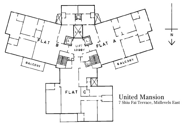 UNITED MANSIONS #騰黃閣, a mid-rise block of 12 storeys built-in 1966, but recently the outside and the lobby has been extensively renovated. There are 3 apartments per floor, giving it a total of 36 units, each with a net area of 1832 sf. Each apartment has a huge balcony and open city views. The typical layout is 3 large bedrooms and 3 bathrooms. It is well located at the far end of Shiu Fai Terrace, next to the steps down to Kennedy Road, making it a short walk to the amenities of Wanchai.